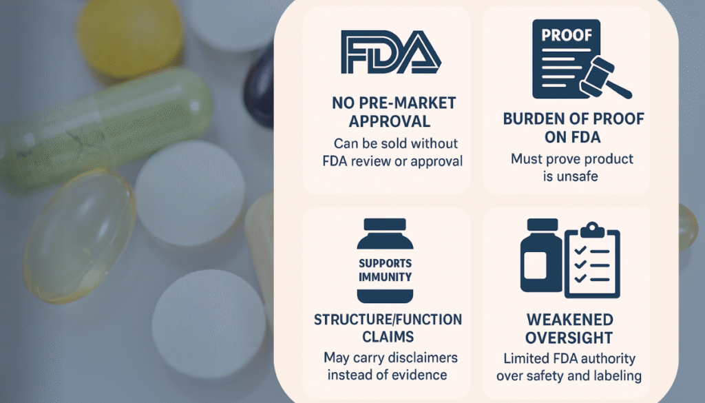 Burden of Proof on the FDA: Instead of manufacturers proving safety, the FDA must prove a supplement is unsafe to remove it from the market—often only after harm has already occurred.